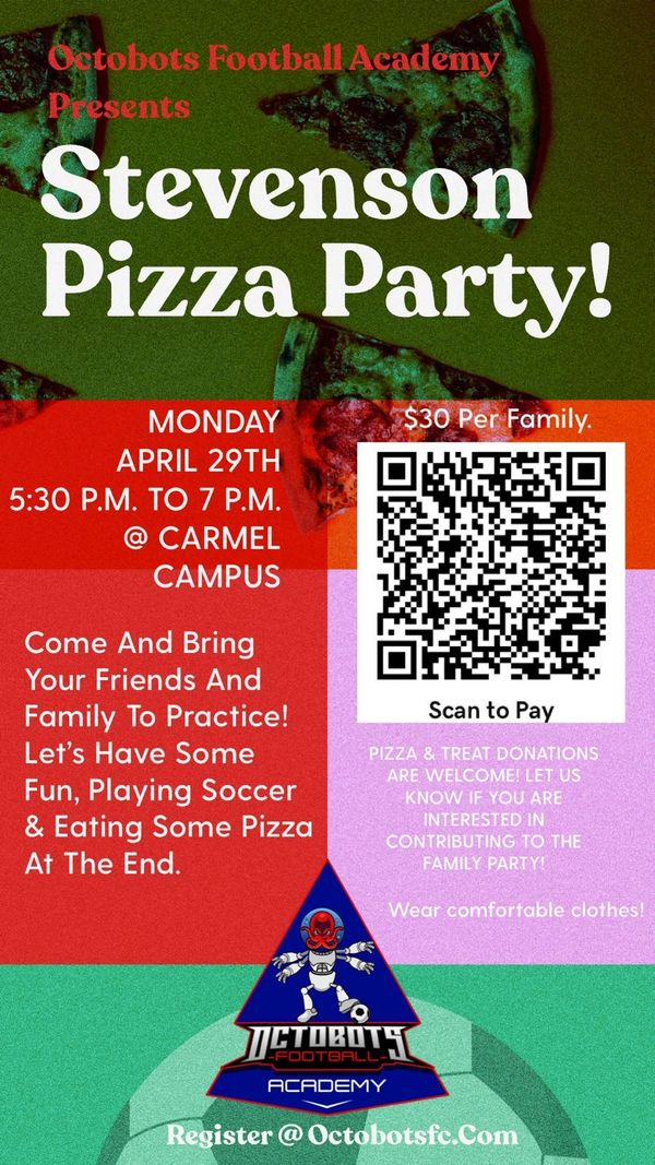 This event is for Stevenson Students and families only, and is part of the Spring program. If you are registered in the spring you don’t need to pay this registration. Bring friends and family to practice! Let’s have some fun, playing soccer & eating some pizza at the end.