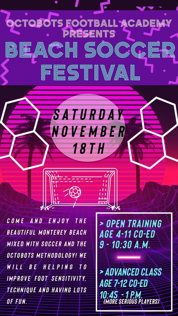 Come and enjoy the beautiful Monterey beach mix with soccer and the octobots methodology, helping to improve foot sensitivity, technique and lots of fun. Bicicle kick, goalkeepers and more!